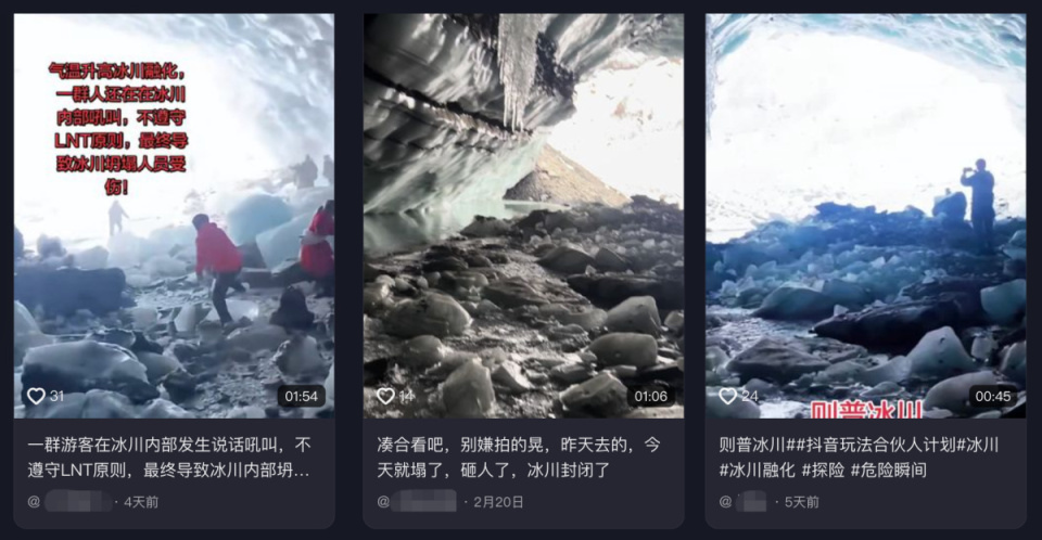 评论区有网友称被砸游客身亡,也有说法称事发时间为“四五天前”。大河报《看见》记者查阅相关社交媒体发现,有发布于5天前的同款视频,但也有发布于2月20日的视频,配文称“今天就塌了,砸人了,冰川封闭了”,其视频内容与上述掉落冰块的溶洞十分相似。