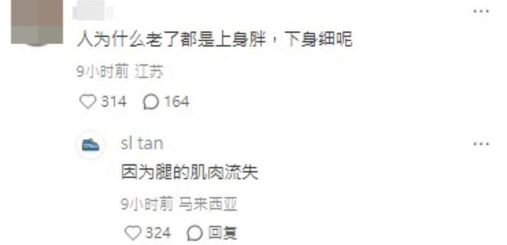 除了引人注目的巨腩,细心的网友还发现,周华健呈现出 " 上身肿胀、下身瘦削 " 的反差体态。有网友在社交平台留言截图中疑问:" 人为什么老了都是上身胖,下身细呢 ",另有网友留言推测:" 或许是年纪大了,腿部肌肉出现流失,才会形成这种体态 "。